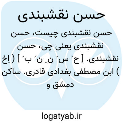 حسن نقشبندی. [ ح َ س َ ن ِ ن َ ب َ ] ( اِخ ) ابن محمدبن حسن بن محمد حسام الدین ساکن استانبول و درگذشته 1284 هَ. ق. اوراست: شرح شمائل ترمذی. ( هدیة العارفین ج 1 ص 302 ).