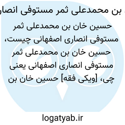 [ویکی فقه] حسین خان بن محمدعلی ثمر مستوفی انصاری اصفهانی، شاعر ادیب و دانشمند اواخر قاجاریه در اصفهان بوده است.