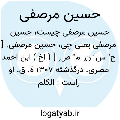 حسین مرصفی. [ ح ُ س َ ن ِ م ُ ص ِ ] ( اِخ ) ابن احمد مصری. درگذشته 1307 هَ. ق. او راست: الکلم الثمان و جز آن.( هدیة العارفین ج 1 ص 330 ) ( اعلام زرکلی 246 چ اول ).