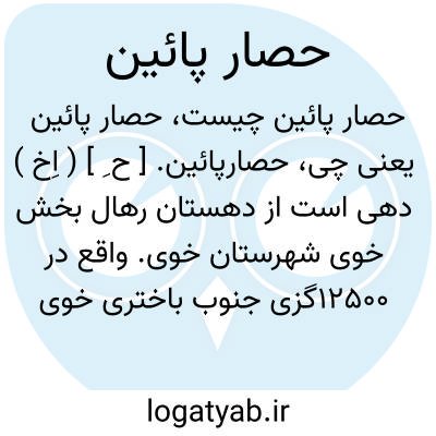 حصارپائین. [ ح ِ ] ( اِخ ) دهی است از دهستان رهال بخش خوی شهرستان خوی. واقع در 12500گزی جنوب باختری خوی و هشت هزارگزی باختر شوسه خوی به سلماس. ناحیه ای است واقع در جلگه، معتدل مالاریائی. دارای 120 تن سکنه میباشد. ترکی زبانند. از رود قطور مشروب میشود. محصولات آنجا غلات. اهالی به کشاورزی گذران میکنند. راه مالرو است. ( از فرهنگ جغرافیایی ایران ج 4 ).
