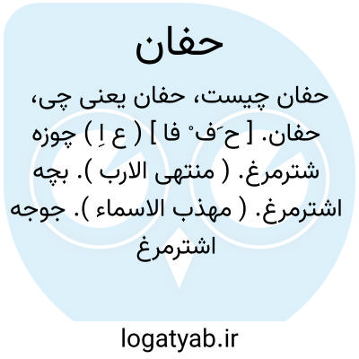 حفان. [ ح َف ْ فا ] ( ع اِ ) چوزه شترمرغ. ( منتهی الارب ). بچه اشترمرغ. ( مهذب الاسماء ). جوجه اشترمرغ و سپس در جوجه و ریزه هر جنس بکار رفته است. ( اقرب الموارد ). || شتران ریزه. ( منتهی الارب ). || خدمتکاران. ( اقرب الموارد )( منتهی الارب ). || آوند پر. پیمانه لبالب. ( اقرب الموارد ). و الواحد حفانة. ( مهذب الاسماء ).