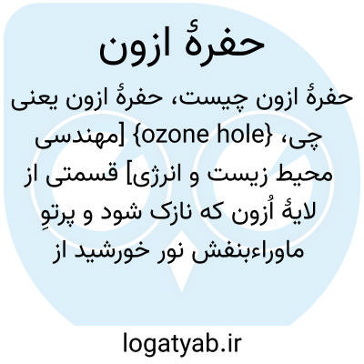 {ozone hole} [مهندسی محیط زیست و انرژی] قسمتی از لایۀ اُزون که نازک شود و پرتوِ ماوراءبنفش نور خورشید از آن عبور کند