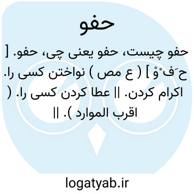 حفو. [ ح َف ْوْ ] ( ع مص ) نواختن کسی را. اکرام کردن. || عطا کردن کسی را. ( اقرب الموارد ). || بازداشتن کسی را از خیر و عطیة. ( منتهی الارب ) ( اقرب الموارد ). بازداشتن از نیکی. ( تاج المصادر بیهقی ). این لغت از اضداد است. || حفو شارب؛ بریدن بروت را بمبالغه. ( اقرب الموارد ). || حفو برق؛ برق ضعیف درخشیدن. ( تاج المصادر بیهقی ) ( اقرب الموارد ).