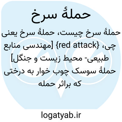 {red attack} [مهندسی منابع طبیعی- محیط زیست و جنگل] حملۀ سوسک چوب خوار به درختی که براثر حمله شاخ و برگ تاج آن به تدریج از سبز به کاهی و سپس به قرمز و درنهایت به قرمز سوخته تبدیل می شود