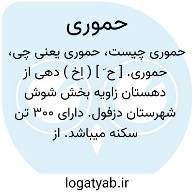 حموری. [ ح َ ] ( اِخ ) دهی از دهستان زاویه بخش شوش شهرستان دزفول. دارای 300 تن سکنه میباشد. از رودخانه دز مشروب میشود. محصولاتش غلات، برنج و کنجد است. اهالی به کشاورزی گذران میکنند. راه آن در تابستان اتومبیل رو است. ساکنین از طایفه عشایر لر هستند. ( از فرهنگ جغرافیائی ایران ج 6 ).
