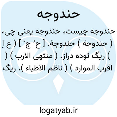 ( حندوجة ) حندوجة. [ ح ُ ج َ ] ( ع اِ ) ریگ توده دراز. ( منتهی الارب ) ( اقرب الموارد ) ( ناظم الاطباء ). ریگ توده خرد. ( ناظم الاطباء ). ج، حنادج ( منتهی الارب ) ( اقرب الموارد )، حنادیج.