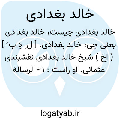 خالد بغدادی. [ ل ِ دِ ب َ ] ( اِخ ) شیخ خالد بغدادی نقشبندی عثمانی. او راست: 1 - الرسالة الخالدیة فی الرابطة النقشبندیة که در مطبعه قازان به سال 1890 م. طبعشد و دارای 29 صفحه است و ایضاً در سال 1892 م. چاپ شد و دارای 36 صفحه است. 2 - الرسالة الخالدیة فی آداب الطریقة النقشبندیة. در این کتاب اسم مؤلف ذکر نشده است و فقط جمله ٔ: بنظر خادم العلم قامجان بن البارودی مثبت است. ( از معجم المطبوعات ج 2 ستون 813 ). خالد بغدادی. [ ل ِ دِ ب َ ] ( اِخ ) خالدبن حسین الشهرزوری. رجوع به خالد ضیاءالدین شود.
