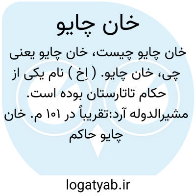 خان چایو. ( اِخ ) نام یکی از حکام تاتارستان بوده است. مشیرالدوله آرد:تقریباً در 101 م. خان چایو حاکم تاتارستان از طرف چین نمایندگانی میفرستد که از راه دریای مغرب، به تسین بزرگ ( روم ) بروند. آنها تا دریای مزبور آمده بواسطه وحشتی که از مشکلات سفر دریا حاصل میکنند صرفنظر کرده برمیگردند. ( از تاریخ ایران باستان ج 3 ص 2469 ).