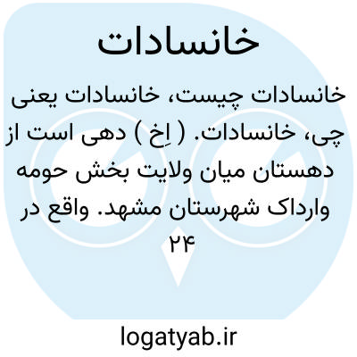 خانسادات. ( اِخ ) دهی است از دهستان میان ولایت بخش حومه وارداک شهرستان مشهد. واقع در 24 هزارگزی شمال باختری مشهد و 2 هزارگزی شمال راه شوسه مشهد بقوچان. ناحیه ای است واقع در جلگه، معتدل و دارای 212 تن سکنه که شیعی مذهب و فارسی زبانند. این ده از قنات مشروب میشود. محصولاتش غلات و اهالی به کشاورزی و مالداری گذران میکنند. راه آنجا اتومبیل رو میباشد. ( از فرهنگ جغرافیایی ایران ج 9 ).