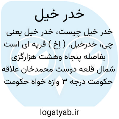 خدرخیل. ( اِخ ) قریه ای است بفاصله پنجاه وهشت هزارگزی شمال قلعه دوست محمدخان علاقه حکومت درجه 3 وازه خواه حکومت کلان کتو از حکومت اعلی غزنی افغانستان بمختصات جغرافیایی زیر: طول شرقی: 67 درجه و 17 دقیقه و 31 ثانیه و عرض شمالی: 33 درجه و 9 دقیقه و 22 ثانیه. ( از قاموس جغرافیایی افغانستان ج 2 ).