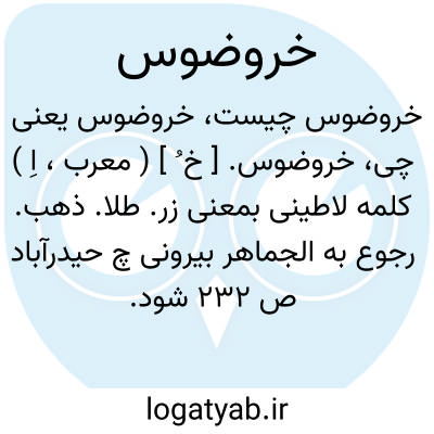 لغت نامه دهخدا خروضوس. [ خ ُ ] ( معرب، اِ ) کلمه لاطینی بمعنی زر. طلا. ذهب. رجوع به الجماهر بیرونی چ حیدرآباد ص 232 شود.