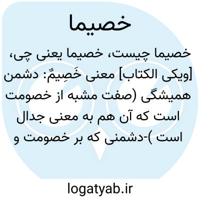 [ویکی الکتاب] معنی خَصِیمٌ: دشمن همیشگی (صفت مشبه از خصومت است که آن هم به معنی جدال است )-دشمنی که بر خصومت و جدال اصرار میورزد - کسی که از دعوی مدعی و یا هر چیزی که در حکم دعوی است دفاع میکند (درجمله "لَا تَکُن لِّلْخَائِنِینَ خَصِیماً "رسول خدا (صلیاللهعلیهوآلهوسلّم) را نه...
