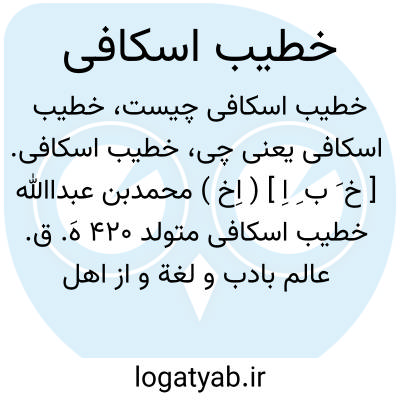 خطیب اسکافی. [ خ َ ب ِ اِ ] ( اِخ ) محمدبن عبداﷲ خطیب اسکافی متولد 420 هَ. ق. عالم بادب و لغة و از اهل اصبهان بود. ابتداء کفشگر بود و سپس خطیب ری شد. از کتب اوست مبادی اللغة و نقدالشعر و درةالتنزیل و عروة التأویل در آیات متشابهه و غلط کتاب العین و الغرة در بعضی از اغلاط اهل ادب و لطف التدبیر در سیاست شاهان. ( از اعلام زرکلی چ 2 ج 7 ص 102 ).