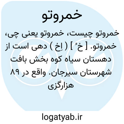 خمروتو. [ خ ُ ] ( اِخ ) دهی است از دهستان سیاه کوه بخش بافت شهرستان سیرجان. واقع در 89 هزارگزی جنوب خاوری بافت سر راه مالرو اسفندقه، دارای 105 تن سکنه. ( از فرهنگ جغرافیایی ایران ج 8 ).