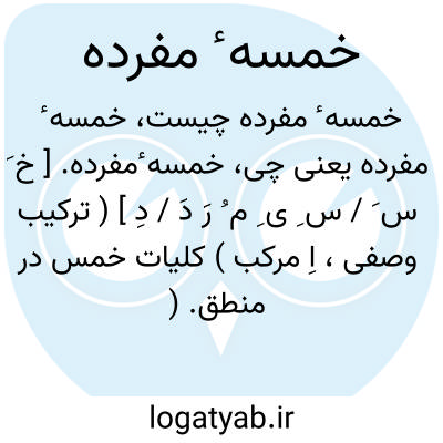 خمسه ٔمفرده. [ خ َ س َ / س ِ ی ِ م ُ رَ دَ / دِ ] ( ترکیب وصفی، اِ مرکب ) کلیات خمس در منطق. ( از اساس الاقتباس ص 27 ). || نزد بلغاء عبارت است از التزام منشی یا شاعر در کلام خود پنج حرف را یعنی «الف » و «واو» و «هاء» و «حاء» و «یاء» یعنی کلمات شعر از این حروف فقط ساخته شود و بیش از این در کلام نیاورد: