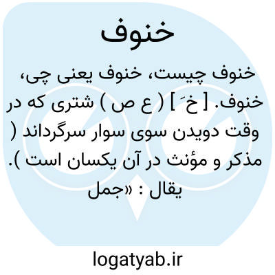 خنوف. [ خ َ ] ( ع ص ) شتری که در وقت دویدن سوی سوار سرگرداند ( مذکر و مؤنث در آن یکسان است ). یقال: «جمل خنوف » و «ناقة خنوف » ج، خنف.