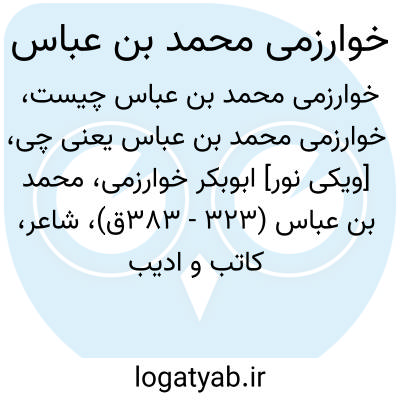 [ویکی نور] ابوبکر خوارزمی، محمد بن عباس (323 - 383ق)، شاعر، کاتب و ادیب بوده است. از آنجا که زادگاه خود و پدرش، خوارزم و مادرش از مردم طبرستان بود، خود را گاه «خوارزمی» و گاه «طبری» معرفی می کرده و دیگران نیز گاه او را با نسبتی مرکب از این دو لفظ، «طبرخزمی» و یا «طبرخزی» خوانده اند.