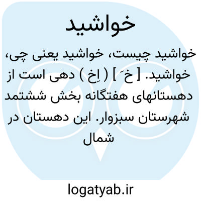 خواشید. [ خ َ ] ( اِخ ) دهی است از دهستانهای هفتگانه بخش ششتمد شهرستان سبزوار. این دهستان در شمال باختری کوه میش واقع و محدود است از شمال بدهستان زمج، از جنوب به بخش بردسکن از شهرستان کاشمر، از خاور بدهستان شامات، از باختر بدهستان همائی و فروغن. راه جدیدالاحداث و شوسه سبزوار و کاشمر از این دهستان عبور می نماید. موقعیت دهستان کوهستانی و هوای آن سرد و بر اثر جریان چشمه های متعدد باغهای زیادی دارد و چون درخت توت زیادی بدانجاست مقدار زیادی پیله ابریشم هر سال تهیه می کند. این دهستان در کوهستان واقع و از جهت مرطوب بودن محل، درخت بادام دیمی زیادی دارد و نیز محصول باغهای انگور آن شیره سفید بسیار مطبوع است که به نقاط دیگر بفروش می رسانند. خواشید از 22 آبادی تشکیل شده و مجموع نفوس آن 6741 تن می باشد.قراء مهم آن عبارتند از بجدن با 985 تن سکنه و استاج با 811 تن سکنه. ( از فرهنگ جغرافیایی ایران ج 9 ).