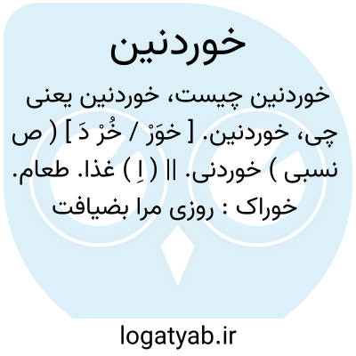 خوردنین. [ خوَرْ / خُرْ دَ ] ( ص نسبی ) خوردنی. || ( اِ ) غذا. طعام. خوراک: روزی مرا بضیافت برد و خوردنین آورد بی گوشت. ( تاریخ طبرستان ).