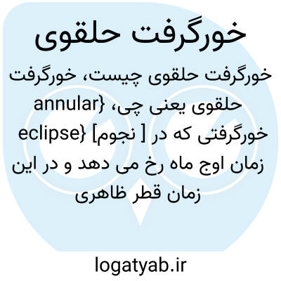 {annular eclipse} [نجوم ] خورگرفتی که در زمان اوج ماه رخ می دهد و در این زمان قطر ظاهری ماه کوچک تر از خورشید است و در میانۀ گرفت (mid-eclipse ) حلقه ای از قرص خورشید در اطراف ماه دیده می شود متـ. گرفت حلقوی