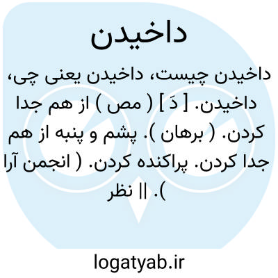 لغت نامه دهخدا داخیدن. [ دَ ] ( مص ) از هم جدا کردن. ( برهان ). پشم و پنبه از هم جدا کردن. پراکنده کردن. ( انجمن آرا ). || نظر بر چیزی افکندن. دیده ور شدن. ( برهان ).
