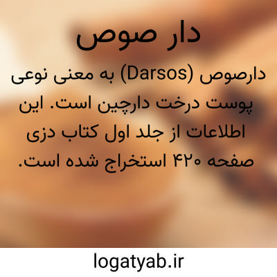 دارصوص (Darsos) به معنی نوعی پوست درخت دارچین است. این اطلاعات از جلد اول کتاب دزی صفحه ۴۲۰ استخراج شده است. این واژه احتمالاً به گونهای خاص از دارچین یا پوست درخت دارچین اشاره دارد که در متون قدیمی یا تخصصی مورد استفاده قرار گرفته است. برای درک دقیقتر معنای آن، نیاز به بررسی بیشتر در منابع لغتنامه و گیاهشناسی است تا مشخص شود که آیا این اصطلاح به یک گونه خاص، منطقه جغرافیایی خاص، یا روش فرآوری خاصی از دارچین مربوط میشود. به طور کلی، دارصوص را میتوان به عنوان یک اصطلاح تخصصی در حوزه گیاهان دارویی یا تجارت ادویه در نظر گرفت که به پوست دارچین با ویژگیهای منحصر به فرد اشاره دارد. واژه دارصوص از دو بخش اصلی تشکیل شده است: دار (Dar): این بخش به وضوح به درخت دارچین اشاره دارد. دارچین (Cinnamomum) نامی علمی از خانواده Lauraceae است که به دلیل پوست معطر و طعم شیرین و تند خود شناخته شده است. صوص (Sos): این بخش از واژه، معنای دقیقتری را به دار میبخشد. در زبان فارسی، صوص میتواند معانی مختلفی داشته باشد، اما در این بافت، احتمالاً به نوعی پوست، تکه، یا بخش خاصی از درخت دارچین اشاره دارد. ممکن است به ویژگیهای فیزیکی خاصی مانند ضخامت، رنگ، یا حالت پوست اشاره داشته باشد. با توجه به منبع ذکر شده (جلد اول کتاب دزی صفحه ۴۲۰)، دارصوص به نوعی پوست درخت دارچین اطلاق میشود. این بدان معناست که تمرکز اصلی این واژه بر روی بخش خاصی از گیاه دارچین، یعنی پوست آن، است.