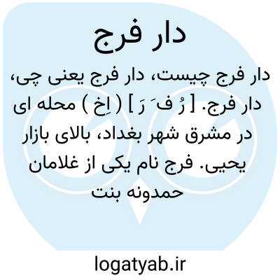 دار فرج. [ رُ ف َ رَ ] ( اِخ ) محله ای در مشرق شهر بغداد، بالای بازار یحیی. فرج نام یکی از غلامان حمدونه بنت غضیض است که از کنیزکان رشید بوده و از او فرزندی آورده است. دار فرج از بناهای استوار کرانه دجله بوده است. ( از معجم البلدان ).