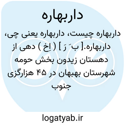 داربهاره.[ ب َ رَ ] ( اِخ ) دهی از دهستان زیدون بخش حومه شهرستان بهبهان در 45 هزارگزی جنوب باختری بهبهان و 8 هزارگزی باختر راه شوسه آغاجاری به بهبهان. دشت گرمسیر مالاریائی و دارای 64 تن سکنه است. آب آن از چشمه.محصول آن غلات، لبنیات. شغل اهالی زراعت و حشم داری است و راه مالرو دارد. ( فرهنگ جغرافیایی ایران ج 6 ).