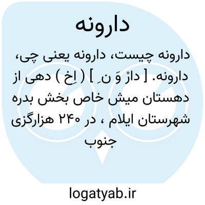 دارونه. [ دارْ وَ ن ِ ] ( اِخ ) ده کوچکی است از بخش صالح آباد شهرستان ایلام که در یک هزارگزی جنوب خاوری صالح آباد و 4 هزارگزی باختر راه شوسه ایلام - مهران واقع و سکنه آن 45 تن است. ( از فرهنگ جغرافیایی ایران ج 5 ).