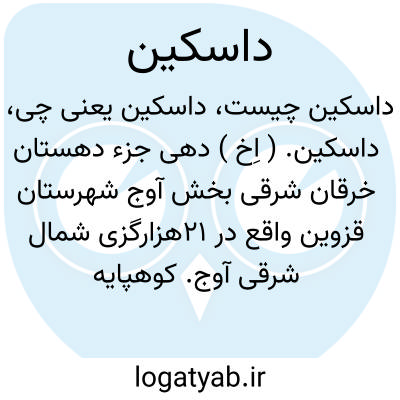 داسکین. ( اِخ ) دهی جزء دهستان خرقان شرقی بخش آوج شهرستان قزوین واقع در 21هزارگزی شمال شرقی آوج. کوهپایه، معتدل و دارای 431 تن سکنه. آب آن از رودخانه هکدر و چشمه سار و محصول آنجا غلات و سیب زمینی و انگور و زردآلو و مختصر قلمستان. شغل اهالی آن زراعت و گلیم و جاجیم بافی و راه آنجا مالرو است. ( از فرهنگ جغرافیایی ایران ج 1 ).
