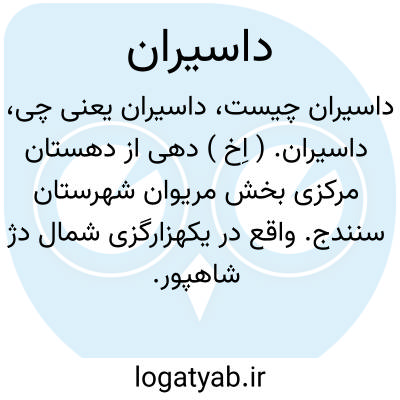 داسیران. ( اِخ ) دهی از دهستان مرکزی بخش مریوان شهرستان سنندج. واقع در یکهزارگزی شمال دژ شاهپور. دامنه. سردسیر دارای 100 تن سکنه است. آب آن از چشمه و محصول آن غلات و شغل اهالی زراعت و گله داری است. ( از فرهنگ جغرافیایی ایران ج 5 ).