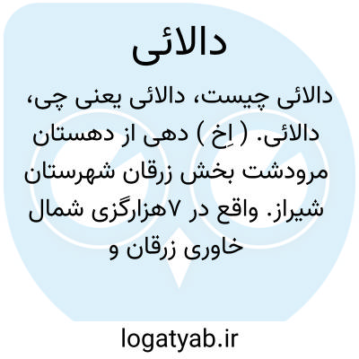 دالائی. ( اِخ ) دهی از دهستان مرودشت بخش زرقان شهرستان شیراز. واقع در 7هزارگزی شمال خاوری زرقان و 3هزارگزی شوسه شیراز به اصفهان. دامنه و معتدل و مالاریایی است و دارای 150 تن سکنه. آب آن از رودخانه سیوند تأمین میشود. محصول آنجاغلات و حبوبات و چغندر است و شغل مردم آنجا زراعت و راه آن مالرو است. ( از فرهنگ جغرافیایی ایران ج 7 ).