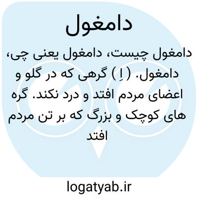 دامغول. ( اِ ) گرهی که در گلو و اعضای مردم افتد و درد نکند. گره های کوچک و بزرگ که بر تن مردم افتد و درد ندارد. دانه ها و گره ها باشد مانند گردکان که از اعضاء و گلوی مردم برمی آید و درد نمیکند و آنرا سلعه میگویند. ( برهان ). خوک. سلعه. خوکک. چخج. ( زمخشری ). جخش. جخج. غده. || غول. غول بیابانی و او نوعی از جن است. ( برهان ). رجوع به غول شود.