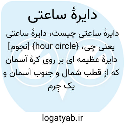 {hour circle} [نجوم] دایرۀ عظیمه ای بر روی کرۀ آسمان که از قطب شمال و جنوب آسمان و یک جِرم مشخص سماوی می گذرد