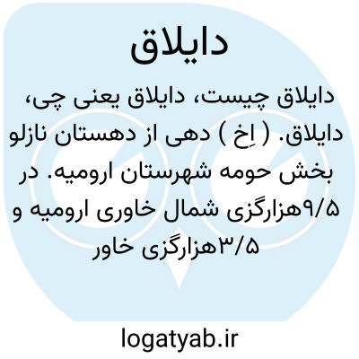 دایلاق. ( اِخ ) دهی از دهستان نازلو بخش حومه شهرستان ارومیه. در 9/5هزارگزی شمال خاوری ارومیه و 3/5هزارگزی خاور شوسه ارومیه بمهاباد. با 99 تن سکنه. آب آن از قنات و چشمه. محصول آنجا غلات وچغندر و توتون و کشمش و حبوبات. شغل اهالی زراعت و راه آن ارابه روست. ( از فرهنگ جغرافیایی ایران ج 4 ).