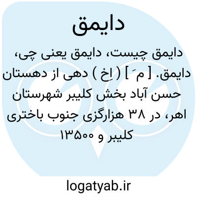 دایمق. [ م َ ] ( اِخ ) دهی از دهستان حسن آباد بخش کلیبر شهرستان اهر، در 38 هزارگزی جنوب باختری کلیبر و 13500 گزی ارابه رو تبریز به اهر با 323سکنه. آب آن از دو رشته چشمه و محصول آنجا غلات و حبوبات شغل اهالی زراعت و گله داری و صنایع دستی گلیم بافی و راه مالروست. ( از فرهنگ جغرافیایی ایران ج 4 ).
