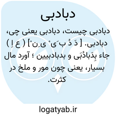 لغت نامه دهخدا دبادبی. [ دَ دُ ب َی ْ ی ِن ْ] ( ع اِ ) جاء بِدَبادُبَی و بدبادبیین؛ آورد مال بسیار، یعنی چون مور و ملخ در کثرت. ( منتهی الارب ).