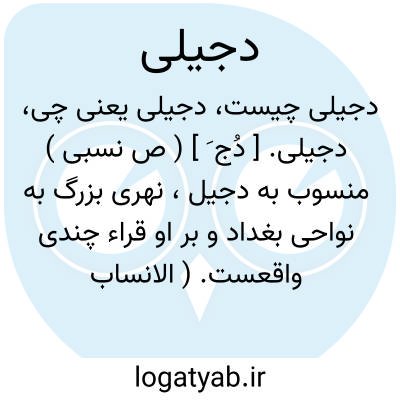 لغت نامه دهخدا دجیلی. [ دُج َ ] ( ص نسبی ) منسوب به دجیل، نهری بزرگ به نواحی بغداد و بر او قراء چندی واقعست. ( الانساب سمعانی ).
