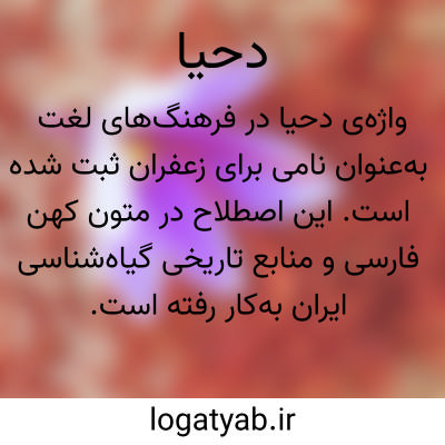 واژه‌ی دحیا در فرهنگ‌های لغت به‌عنوان نامی برای زعفران ثبت شده است. این اصطلاح در متون کهن فارسی و منابع تاریخی گیاه‌شناسی ایران به‌کار رفته و نشان‌دهنده‌ی غنای زبان فارسی در حوزه‌ی نام‌گذاری گیاهان دارویی است. برای نمونه، در کتاب تحفه‌ی حکیم مؤمن که از متون معتبر طب سنتی به‌شمار می‌رود، به‌روشنی به این معنا اشاره شده است. زعفران که با نام علمی Crocus sativus شناخته می‌شود، از دیرباز در ایران به‌عنوان گران‌بهاترین ادویه و گیاه دارویی کشت می‌شده است. کاربرد واژه‌ی دحیا در متون قدیمی، علاوه بر نشان‌دادن پیشینه‌ی کشت و استفاده از این گیاه، گویای توجه حکمای ایرانی به ثبت دقیق خواص دارویی گیاهان در منابع مکتوب است. این امر نقش مهمی در حفظ و انتقال دانش گیاه‌شناسی و طب سنتی ایران به نسل‌های بعدی ایفا کرده است. امروزه اگرچه واژه‌ی زعفران جایگزین مصطلح دحیا شده است، اما مطالعه‌ی چنین واژه‌هایی در متون تاریخی، برای پژوهشگران حوزه‌ی زبان‌شناسی، تاریخ علم و گیاه‌شناسی از اهمیت ویژه‌ای برخوردار است. این مطالعات نه‌تنها درک بهتری از تحول زبان فارسی ارائه می‌دهد، بلکه بر عمق تمدن کشاورزی و پزشکی ایران زمین نیز صحه می‌گذارد.