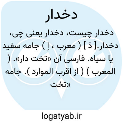 دخدار.[ دَ ] ( معرب، اِ ) جامه سفید یا سیاه. فارسی آن «تخت دار». ( المعرب ) ( از اقرب الموارد ). جامه «تخت دار». ( منتهی الارب ) ( آنندراج ). چادر سیاه و سفیدی را گویند که بر روی تخت پوشند. و بعضی گویند معرب «تخت دار»است که جامه خواب باشد. ( برهان ). مأخوذ از «تخت دار» فارسی جامه سیاه یا سپید که در قدیم تخت پادشاهان را بدان می پوشانیدند. ( ناظم الاطباء ). || زر. طلا. ( اقرب الموارد ) ( آنندراج ) ( ناظم الاطباء ).