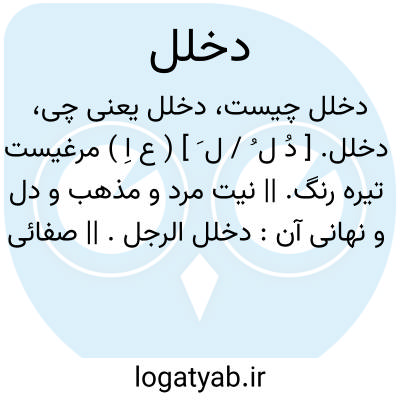 دخلل. [ دُ ل ُ / ل َ ] ( ع اِ ) مرغیست تیره رنگ. || نیت مرد و مذهب و دل و نهانی آن: دخلل الرجل. || صفائی درون خم؛ دخلل الحب. ( منتهی الارب ).