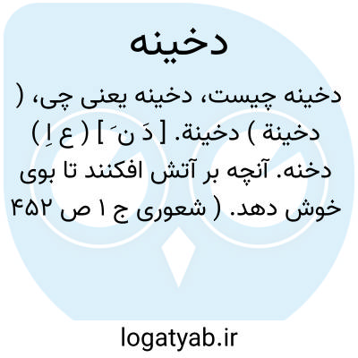 ( دخینة ) دخینة. [ دَ ن َ ] ( ع اِ ) دخنه. آنچه بر آتش افکنند تا بوی خوش دهد. ( شعوری ج 1 ص 452 ).آنچه بر آتش افکنند از عطریات. رجوع به دخنه شود.
