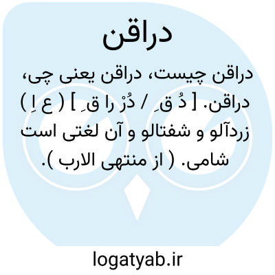دراقن. [ دُ ق ِ / دُرْ را ق ِ ] ( ع اِ ) زردآلو و شفتالو و آن لغتی است شامی. ( از منتهی الارب ). خوخ. ( ذیل اقرب الموارد از تاج ). شفتالو. هلو. خوخ. و اینکه صاحب قاموس گوید: الدراقن کعلابط و یشدد، المشمش و الخوخ شامیة، خلطی است چه مشمش زردآلو و دراقن و خوخ شفتالو باشد. ( یادداشت مرحوم دهخدا ). عربهای شام خوخ را دراقن گویند و آن معرب از سریانی یارومی است. ( از المعرب جوالیقی ص 143 از ابن درید ).