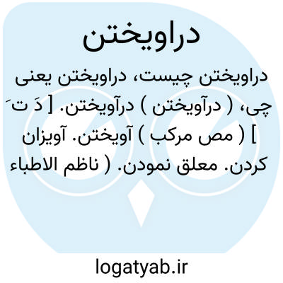 چو خونین ورقهای جوشنوران.منوچهری.از زر و سیم قندیلها کردند و از سقف درآویختند. ( قصص الانبیاء ص 175 ). هرکه گوش روباه از گهواره طفل درآویزد طفل گریان و کودک بدخوی از گریستن بازایستد. ( سندبادنامه ص 329 ). در آهنین از درهای عموریه به بغداد آورد [ معتصم خلیفه ] و به دری از درهای دارالخلافه که آنرا باب العامه گویند، درآویخت. ( تجارب السلف ). تا بدان میرسید که ایشان را سرنگون درمی آویختند و می زدند و سراهای ایشان خراب می کردند. ( تاریخ قم ص 161 ). تسمیط؛ چیزی از دوال زین درآویختن. ( دهار ). تقلید؛درآویختن چیزی در گردن ستور قربانی جهت علامت هدی. ( از منتهی الارب ). شنق؛ درآویختن مشک از جای. ( تاج المصادر بیهقی ). نوط؛ چیزی از جای درآویختن. ( دهار ). || بر چیزی یا بر کسی آویختن. ( ناظم الاطباء ). از او آویزان شدن. درآویختن. اعتلاق. التحاص. انتشاب.ایشاق. تشبب. ( منتهی الارب ). تعلق. ( دهار ). تکنع. علق. عنقشة. لَجَن. نَشَب. نَوط. ( منتهی الارب ):