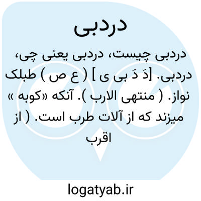 دردبی. [دَ دَ بی ی ] ( ع ص ) طبلک نواز. ( منتهی الارب ). آنکه «کوبه » میزند که از آلات طرب است. ( از اقرب الموارد ).