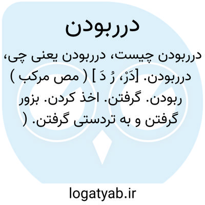 درربودن. [دَرْ، رُ دَ ] ( مص مرکب ) ربودن. گرفتن. اخذ کردن. بزور گرفتن و به تردستی گرفتن. ( ناظم الاطباء ). بسرعت گرفتن. بشتاب جدا کردن. بزور بردن. تخطف. ( تاج المصادر بیهقی ). خَطف. بلند کردن ( در تداول عامه ): درحال بادی از هوا برآمد و آن مال از او درربود. ( قصص الانبیاء ص 176 ). اگر دریا در موج آید و بچگان را دررباید آنرا چه حیلت توان کرد. ( کلیله و دمنه ). زاغ... پیرایه درربود. ( کلیله و دمنه ). چنان تقریر کردند که شاهزاده را شیری در ربود. ( سندبادنامه ص 253 ).