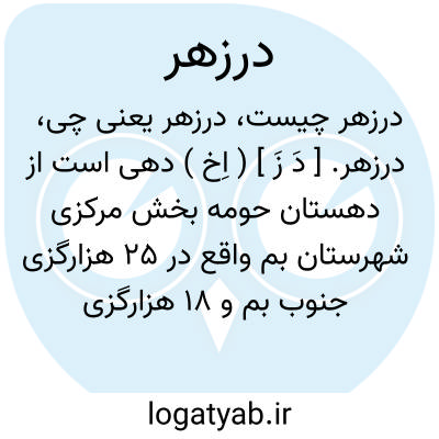 درزهر. [ دَ زَ ] ( اِخ ) دهی است از دهستان حومه بخش مرکزی شهرستان بم واقع در 25 هزارگزی جنوب بم و 18 هزارگزی خاور راه فرعی بم به کروک. آب آن از قنات و راه آن مالرو است. ( از فرهنگ جغرافیایی ایران ج 8 ).