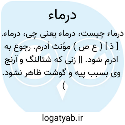 درماء. [ دَ ] ( ع ص ) مؤنث أدرم. رجوع به ادرم شود. || زنی که شتالنگ و آرنج وی بسبب پیه و گوشت ظاهر نشود. ( منتهی الارب ) ( از اقرب الموارد ). ج، دُرم. ( منتهی الارب ). || که او را دندان نباشد. ( از اقرب الموارد ). || ( اِ ) درما. خرگوش. ( منتهی الارب ). أرنب. ( اقرب الموارد ). || شوره. گیاهی است سرخ برگ. ( منتهی الارب ). گیاهی است با برگهای سرخ رنگ. ( از اقرب الموارد ).