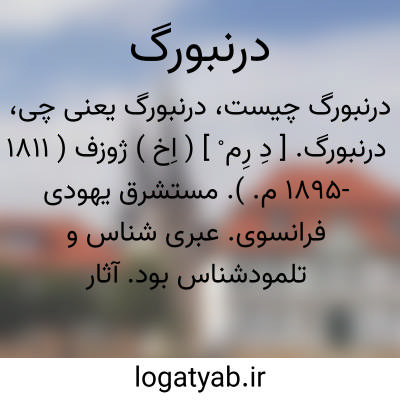 درنبورگ. [ دِ رِم ْ ] ( اِخ ) ژوزف ( 1811 -1895 م. ). مستشرق یهودی فرانسوی. عبری شناس و تلمودشناس بود. آثار عمده اش عبارتست از: قصص لقمان، مقامات حریری، رساله در تاریخ فلسطین بر طبق تلمود، صرف ونحو عبری به زبان عربی. ( از دائرةالمعارف فارسی ).