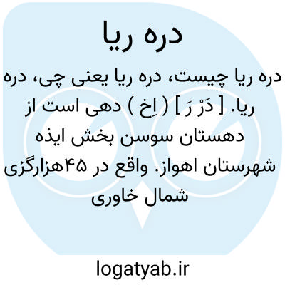 دره ریا. [ دَرْ رَ ] ( اِخ ) دهی است از دهستان سوسن بخش ایذه شهرستان اهواز. واقع در 45هزارگزی شمال خاوری ایذه. آب آن از چشمه و راه آن مالرو است. ( از فرهنگ جغرافیایی ایران ج 6 ).